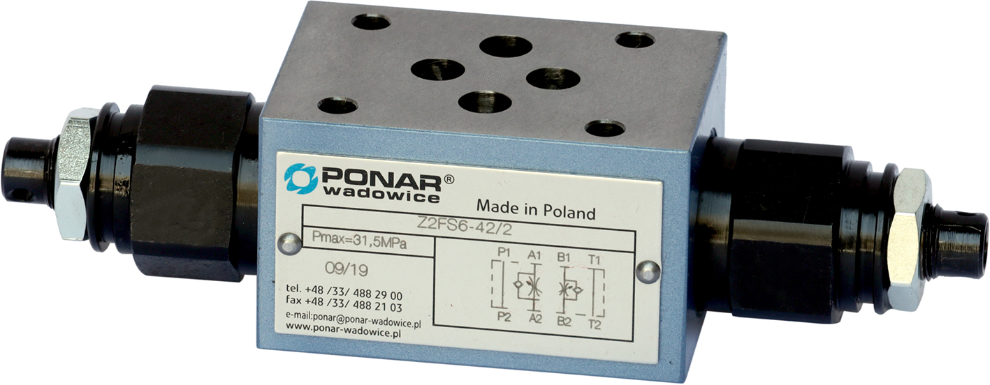 Throttle/check valve type Z2FS 10is used to control main flow rate (or pilot flow rate) in one direction of flow and to allow free flow in the opposite direction. The valve may be designed as double version (twin version – valve function is realized in two ports A and B) or single version (valve function is realized in one port A or B). The valve is applied to vertical stack mounting (sandwich plate) – generally is fitted between a sub-plate and a directional valve of the same nominal size and in this case is used to limit main flow rate (to control the speed of a receiver movement).